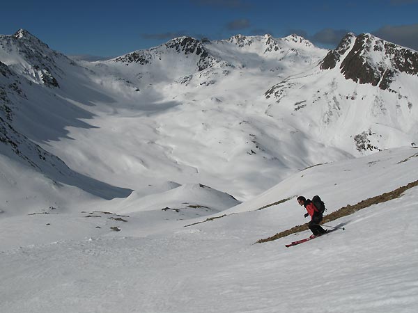 Tourenverhältnisse: Ab Staller Sattel geschlossene Schneedecke, also durchwegs ausreichend Schnee, wenn auch keine großen Mengen. Aus dem Liftgebiet von St. Jakob kann man auch sehr gut einige Skitouren unternehmen, hier ist sogar noch eine abschließende Talabfahrt möglich! Es hat im gesamten Gebiet typische Frühjahrsverhältnisse, es gibt in allen Expositionen Firnverhältnisse. Bei unserer Tour am Mittwoch war die Nacht kalt genug für ein oberflächliches Frieren, daher herrschten bei früher Abfahrt sehr gut Verhältnisse.