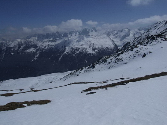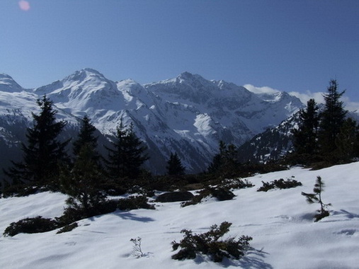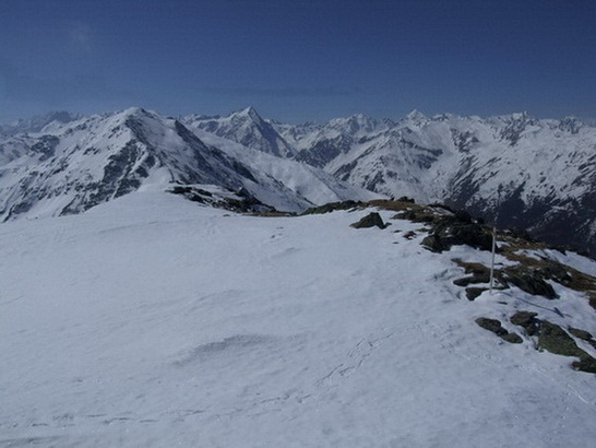 - Blick in die Runde: W-seitige Hänge (z.B. Schafleger) haben eine wesentlich tiefere Schneegrenze als O-Hänge; S-Flanken gegenüber (z.B. Rosskogel, Seejoch) sind auf 2/3 aper; die südlicheren Ziele im Lisener/Fotscher Tal sehen dagegen noch recht "brauchbar" aus...