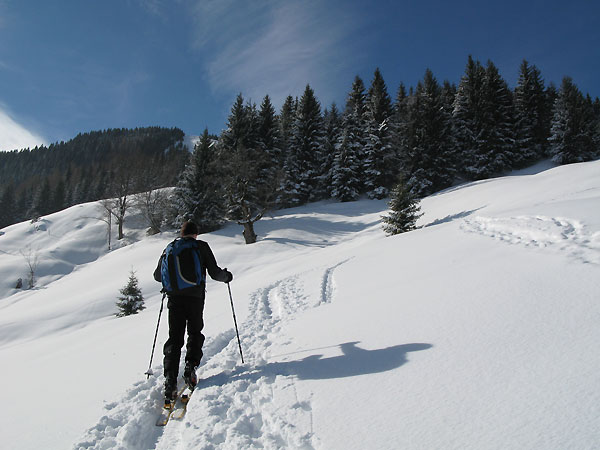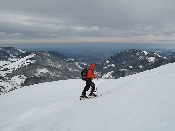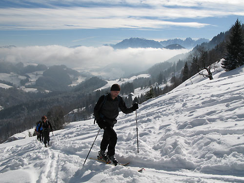 Tourenverhältnisse: wie von Joachim beschrieben. Unten 20 cm oben 30 cm Pulverschnee mit noch schlechter Bindung zur harten, verharschten Altschneedecke.