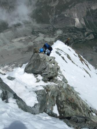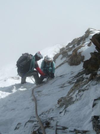 Am 12.07. (Di) um 3.50 starteten wir zusammen mit drei oder vier Bergführerseilschaften, denen wir trotz deren enorm hohen Tempo folgen konnten und (nur!) so keine Probleme in der Dunkelheit mit der Wegfindung hatten. Steigeisen waren ab ca. 3800m nötig, denn ab hier lag zunehmend Neuschnee und auch harte Altschneereste. Im Bereich der Schulter große Schneefelder. Der Abschnitt mit den Fixseilen oberhalb der Schulter ist überraschend lang und sehr steil mit einer überhängenden und einer senkrechten Stelle, so dass das Hochziehen ganz schön anstrengend ist. Im Bereich des Daches überwiegend tiefer Schnee, an manchen Stellen traf man aber auch auf nur wenig verschneiten Fels. Kein guter Stapfschnee und keine gute Spur (laut Hüttenwirt war in den vorherigen vier Tagen niemand am Gipfel). Da an diesem Tag nur ca. 15 Personen ganz oben waren, hatten wir den Gipfel zeitweise sogar für uns allein.