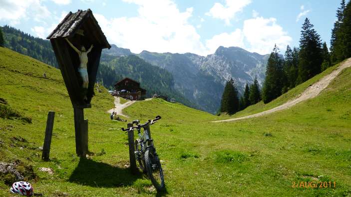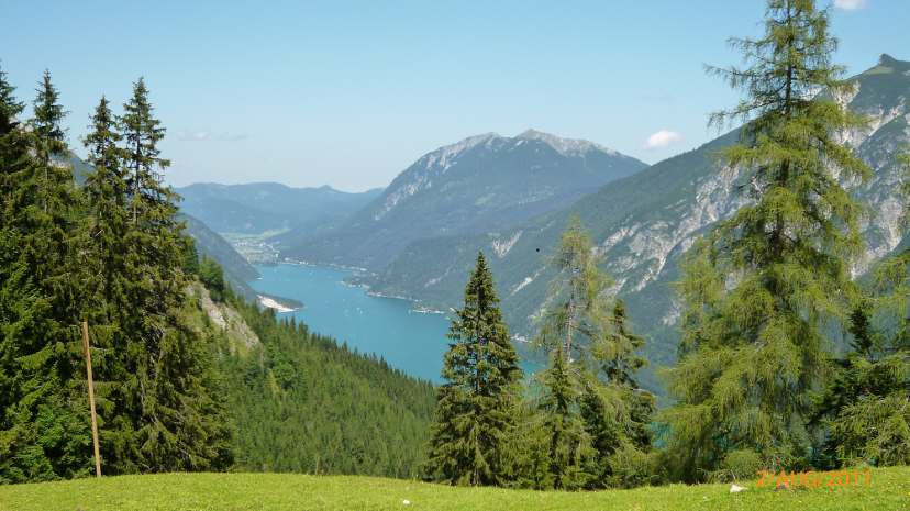 Top Wetter mit bester Sicht, insbesondere hinunter zum Achensee. Alm stark frequentiert durch Fußgänger,