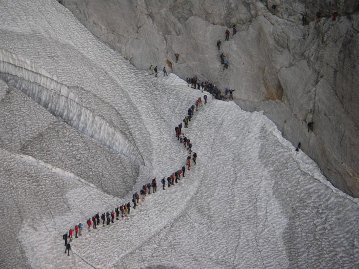 Letzte Wochenende wurde aus dem Rettungshubschrauber der Unfallklinik Murnau dieses kuriose und aufschlussreiche Bild gemacht. Ca. 60 Bergsteiger stehen brav und ohne Vordrängeln an der Randkluft in einer langen Schlange an, um diese zu überwinden und anschließend in die Klettersteigpassage einzusteigen.