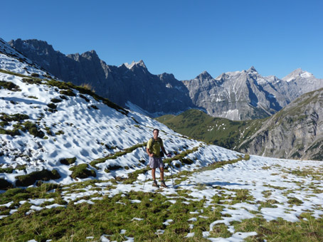 Tourenverhältnisse: Wir sind "diretissima" rauf und runter, also von der Eng übers Gumpenkar zum Gipfel und da auch wieder zurück. Zwischendurch gaaaanz kurze und völlig unproblematsiche Schneepassagen - wir waren in kurzer Hose und ohne Gamaschen unterwegs. Traumhafte Spätsommerverhältnisse! Durch die südseitige Exposition ist der Weg auch oberhalb des Jöchls weitgehend trocken bzw. schneefrei. Und wenn es doch mal weiß ist: 10 cm, sulzig - eher Erfrischung als Hindernis...