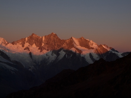 Gefahreneinschätzung: Spaltensturzgefahr auf dem Nordabstieg nach Hohsaas. Im Anstieg am Südgrat besser am Grat bleiben, der kleine, steile Gletscher östlich davon (auf der Hütte als Anstiegsvariante bezeichnet) erhält ab Sonnenaufgang viele, tw. gewaltige, Geschosse vom Grat.