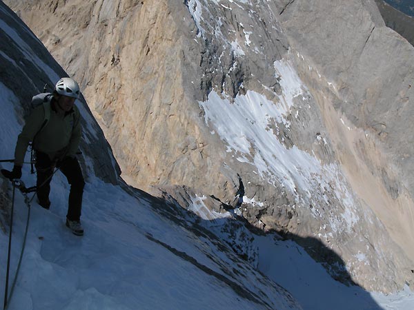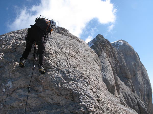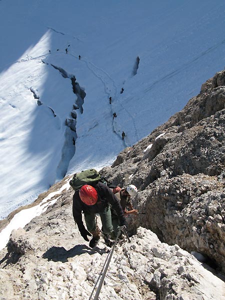 Tourenverhältnisse: Aufstieg über den Westgrat-Klettersteig. Hier nur noch wenig Schnee, Seil fast immer frei, jedoch einige eisige Stellen. Wir sind hier ohne Steigeisen durch, andere haben sie angelegt. Der Zustieg erfolgt über den kleinen Gletscher, der zur Zeit von relativ trittfesten, aber schon eher mit hartem Schnee bedeckt ist.