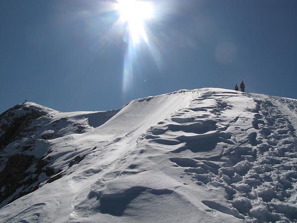 Abstieg über die Normalroute. Die ist zur Zeit in perfektem Zustand. Sehr schöne griffige Schnee-Spur über Grat und Gletscher - fast winterliche Verhältnisse - sehr gut zu gehen. Anseilen obligatorisch wegen der doch großen Spalten - Steigeisen trotz guter Verhältnisse sehr angenehm. Felsrinne mit Drahtseil fast schneefrei und problemlos.