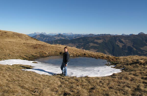 Tourenverhältnisse: Fast durchwegs trocken, nur ganz wenige und ganz kurze Stellen eisig. Etwa 20 Minunten ging's von unten weg noch im Schatten, dann liegt der Weg herrlich in der Sonne. Schön warm oben, kein Wind! Herrliche ruhig derzeit in den Kitzbüheler Alpen - keine Menschenseele weit und breit.