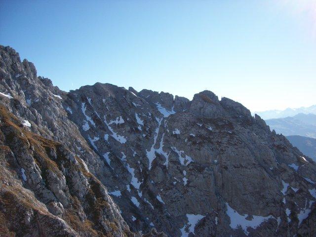 Tourenverhältnisse: Nahezu perfekt. Bin über die Kaiser- und Kaiserhochalm aufgestiegen, dann unterhalb vom Sonnenstein gequert bis zum zur Zeit ausgetrockneten Wasserfall auf 1500 m. Bis zum Schneekar und weiter zum Treffauer-Gipfel durch schrofiges Gelände, am Schluß braucht man die Hände, aber keine wirklich schwierige Kraxelei zum Gipfel. beim Aufstieg keine Schneefelder. Danach Gratquerung (zwei kurze eisige Stellen, aber mit guten Tritten) zum Tuxegg - den hab ich mangels Seil bleiben lassen - und dann sehr steil und sehr geröllig hinunter zur Wegscheid Hochalm und bis zum Parkplatz. Beim Abstieg muss man unterhalb vom Tuxegg durch eine Schneerinne - beinhart gefroren! Grödel, besser noch Steigeisen sind angenehm und zu empfehlen, auch wenn es nur um die 50 Meter sind. Wenn man, so wie ich heute, das Zeug daheim liegen lässt hilft man sich mit Steinen, mit denen man die vorhandenen Stufen "streuen" kann. Auch ein Helm schadet bei diesem Abstieg nicht. Einige schöne Kraxelstellen, die gut versichert sind.