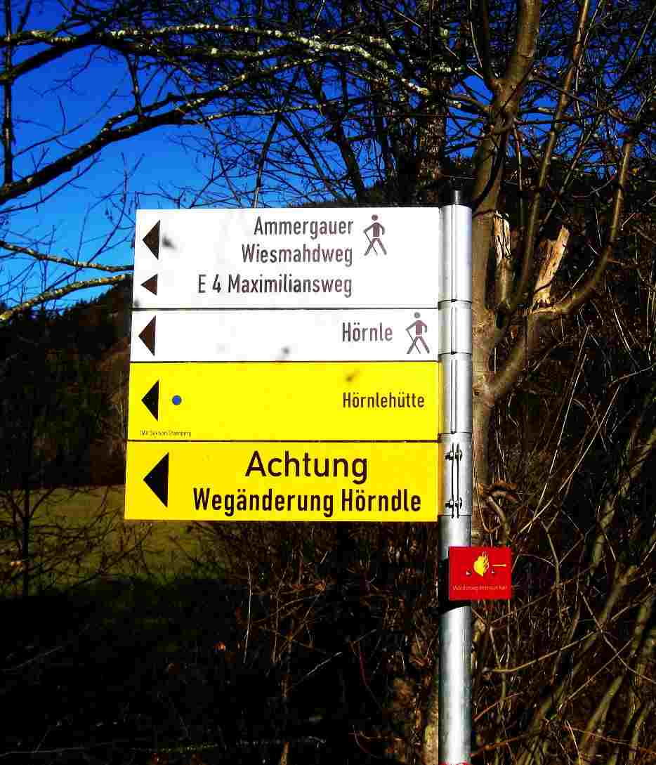 Kurz hinter der Kapelle hat uns eine Tafel (Bilder) in einen schweren Gewissenskonflikt gebracht. Sie wollte uns auf den Forstweg nach Wurmansau umleiten - zugegeben, über diesen wären wir auch irgendwie aufs Hörnle gekommen. Wir sind trotzdem wie mit & ohne Ski gewohnt gradaus weitergegangen. Trotz höchster Konzentration nichts Auffälliges bemerkt. Den selben Weg wieder runter - gemütlich wie im Aufstieg in Senioren gerechten 1+1/2 Stunden. - Ob sich andere Bergkameraden (und wenn, wie viele) an die "Wegänderung" gehalten haben? Offene Frage.