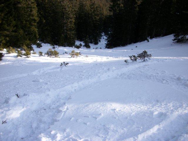 Tourenverhältnisse: Sonnig und zu warm, aufkommender Föhn. Passable Schneeschuhverhältnisse, war für die heutige Tour die beste Wahl, denn fürs Skifahren hat es nur vereinzelt brauchbare Stellen, wie z.B. die Schneise unterhalb der Simetsberg-Diensthütte gegeben. Früh hätte man vom Parkplatzweg mit Skiern aufsteigen können, am Nachmittag war bis 1200 m der Schnee schon wieder weg. Gipfelhang abgeblasen, und die Sonne schleckt das, was an Schnee übrig ist, auch noch weg.
