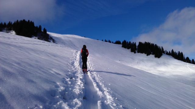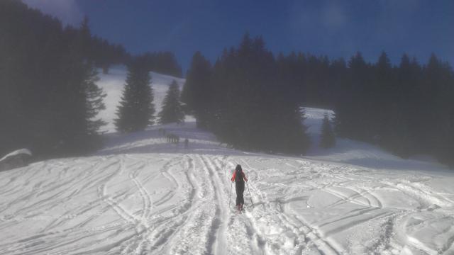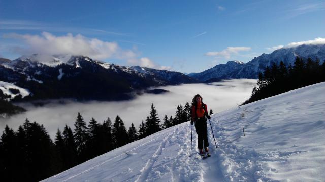 Tourenerhältnisse: Schnee durch die warmen Temperaturen stark gesetzt - Menge wirklich ausreichend. Allerdings recht schwerer Schnee. Traumhaftes Wetter oberhalb des Nebels.
