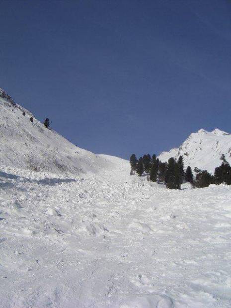 Gefahreneinschätzung: Die Lawine an der Nordflanke vom Lisener Fernerkogel ist bereits abgegangen - keine Gefährdung mehr (siehe Foto) - Bis auf den Gipfelhang wenig gefährdet, Gipfelhang wurde an diesem Tag (LWS4) nicht begangen!