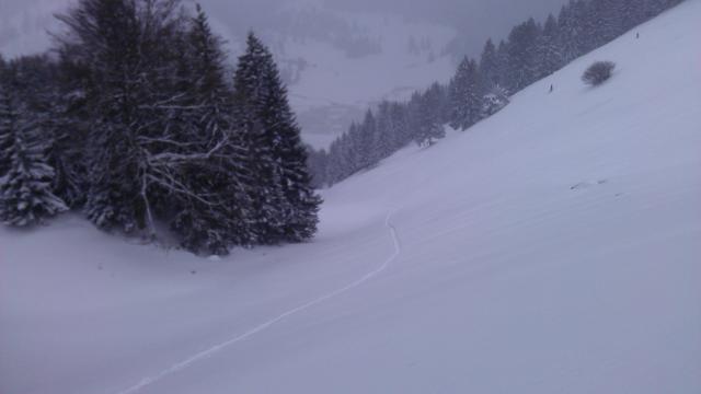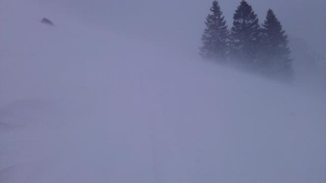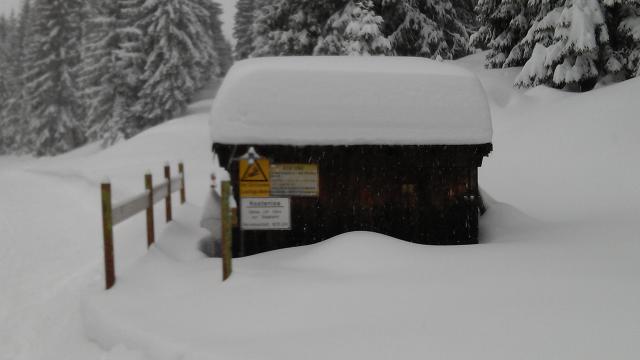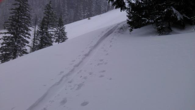 Verhältnisse: Durchgehend Schneefall und zum Teil stürmischer Wind. Ausreichend Schnee, am Ausgangspunkt ca. 50 cm, oben mehr. Allerdings durch den Wind recht unterschiedliche Schneehöhen von abgeweht bis ca. 1 m. Die Abfahrt zur Krottenthaler-Alm war ein Pulvertraum, die Piste war schon gewalzt, Lifte laufen aber noch nicht. Oberhalb der Waldgrenze aufpassen, Verfrachtungen!