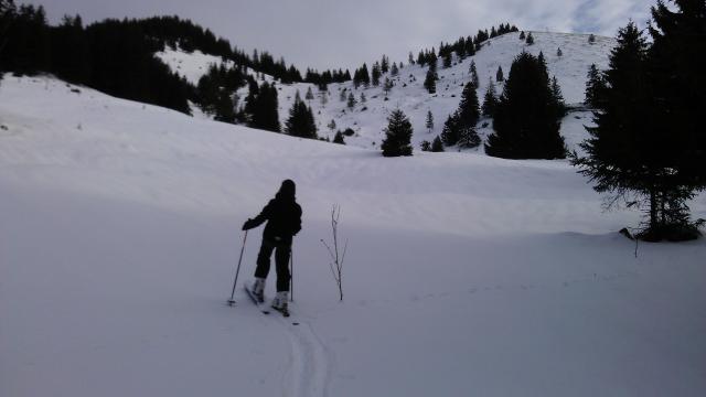 Der Südwesrt-Rücken (Routen vorn herum) war stark abgeweht, deshalb sind wir von hinten durch das Tälchen aufgestiegen und auch abgefahren. Hier sehr gute Verhältnisse, 5 cm Neuschnee auf harschiger, tragender Unterlage. Noch fast unverspurt. Lacherkar und Weitalpspitze sahen auch gut aus.