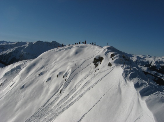 Tourenverhältnisse: überraschend gut. Zwar waren es wechselnde Schneeverhältnisse (schattseitig noch pulvrig, sonnseitig schon etwas schwerer), aber nirgendswo Bruchharsch. Auch die Schneemenge war ausreichend, aber meist alles schon zammgfahrn. Am Gipfel warm, wolkenlos und windstill.