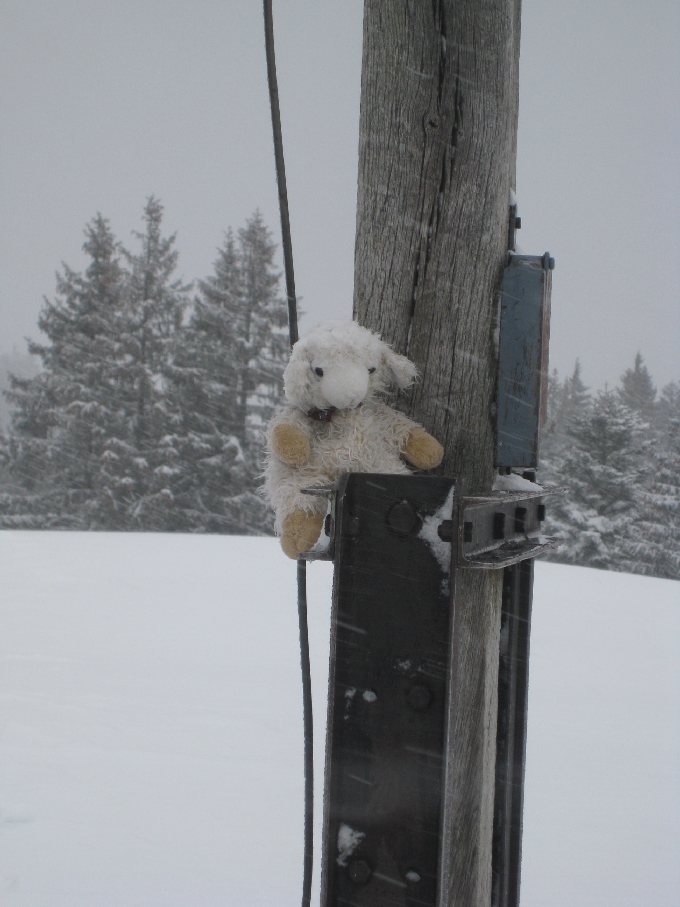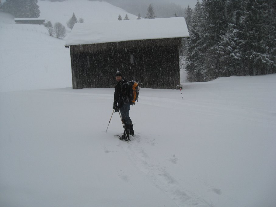 Tourenverhältnisse: Trotz kräftigem Schneefall gerade mal 10-15 cm Neuschnee auf den unteren Wiesen auf dünner Unterlage. Oben stark abgeblasen. Bei der Rückkehr am Parkplatz bereits Übergang zu Schneeregen.
