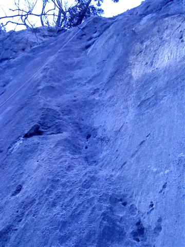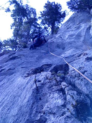 Tourenverhältnisse: Wand stellenweise noch sehr nass und glitschig, aber zumindest in den leichteren Routen (irgendwie) schon kletterbar. Schnee bis an den Wandfuss (kaum Gelegenheit sich die Kletterschuhe anzuziehen und an die Wand zu kommen, ohne dass diese nass werden).