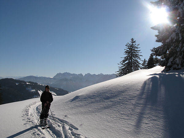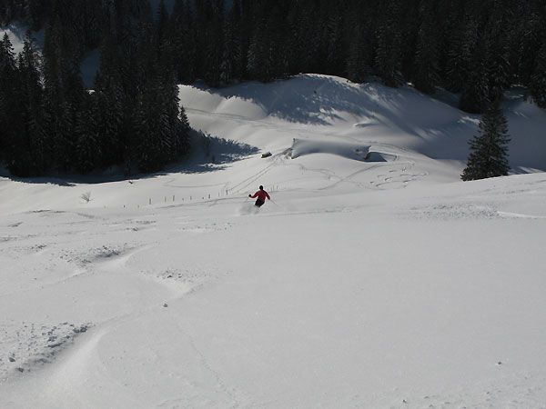 Schnee: 10 cm Pulver auf harter Unterlage. Die Abfahrt ab Spitzsteinhaus ist eine gute Piste. Ein perfekter Tag!