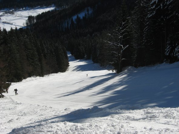 Tourenverhältnisse: eine Schneemenge, wie schon lange nicht mehr. Der Tourenbereich war zwar umgepflügt oder pistenartig eingefahren, aber immer noch pulvrig (natürlich so gut wie kein wirklicher Tiefschnee). Auch der Pistenteil war in sehr gutem Zustand (nicht hart, keine Steine, keine braunen Flecken). Insgesamt alles leicht zu fahren.
