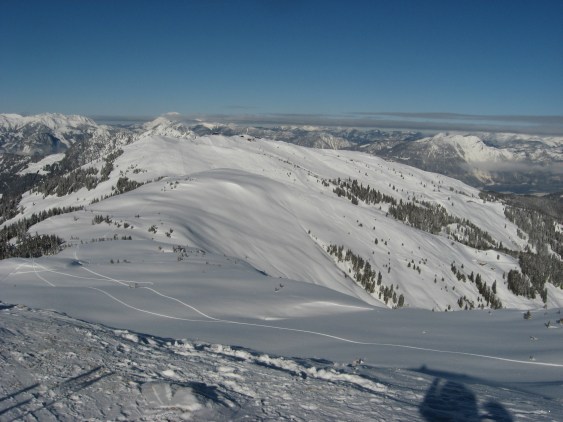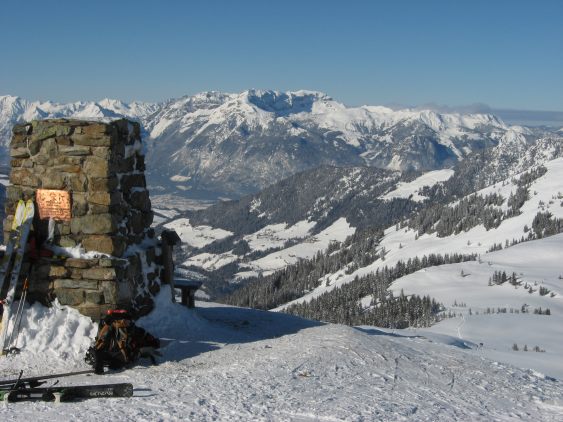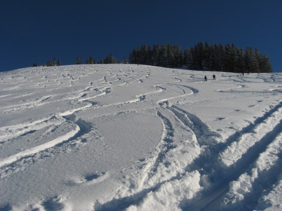 Tourenverhältnisse: sehr gut. Vom Gipfel bis zum Parkplatz Pulverschnee auf gut gesetzter Unterlage, der allerdings zusehends zammgfahrn wird (heute war noch etwas Platz für eigene Bögerl). Ein Kaiserwettertag (wolkenlos und nur wenig Wind bei angenehmen Temperaturen).