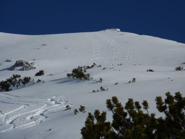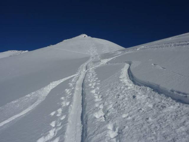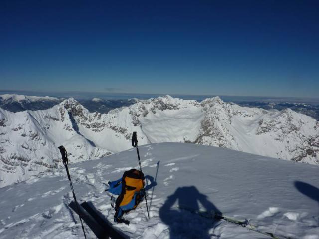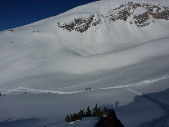 Gipfelkamm Pulver, nicht abgeblasen, oberhalb Hütte Latschen alle eingeschneit, Waldabfahrt sehr "rasant", Gipfelhang noch viel Platz für Spuren und traumhaftes Wetter