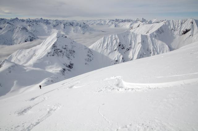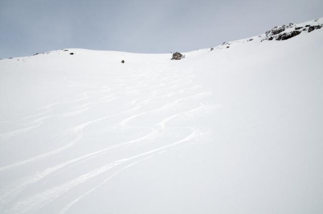 Ansonsten - wie bekannt - sehr üppige Schneelage. Am südwärts gerichteten Gipfelhang bereits Harschdeckel, dafür konnt man (unserer Meinung nach ziemlich risikolos) in Abfahrtsrichtung rechts in den Steilhang einfahren. Ansonsten bester Pulver, nur unten vor Fallerschein etwas schwer.