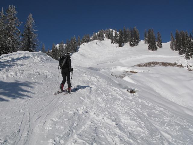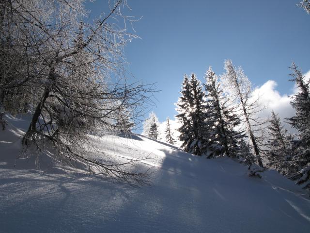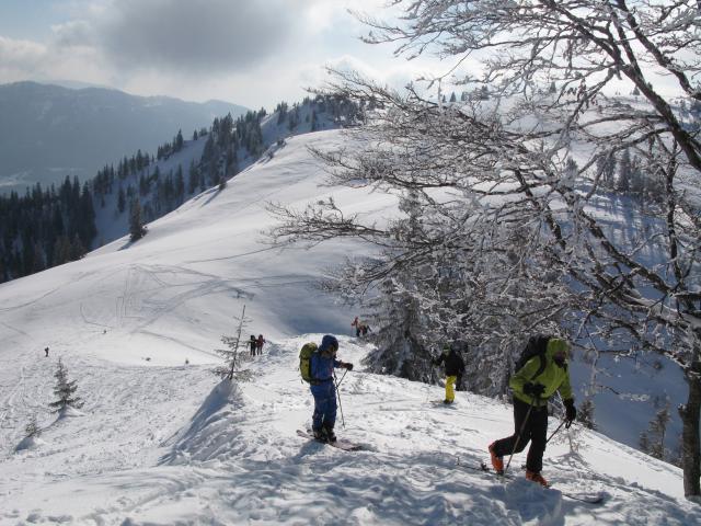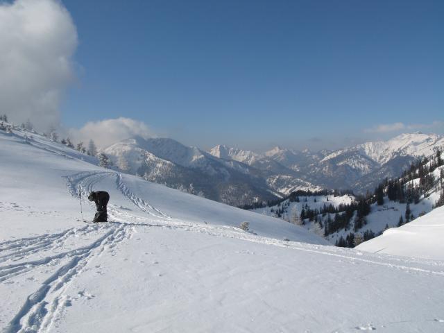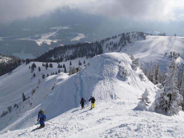 Tourenverhältnisse: Noch sehr gute Tourenverhältnisse. Auch wenn die Hauptabfahrtsroute schon recht verspurt ist, es ist alles noch schön pulvrig. Die Zusatzabfahrt nach Osten zur Trainsalm war ein Traum! Hier noch viel Platz für Spuren.
