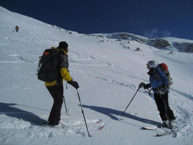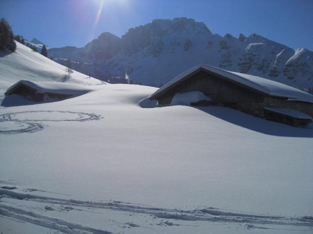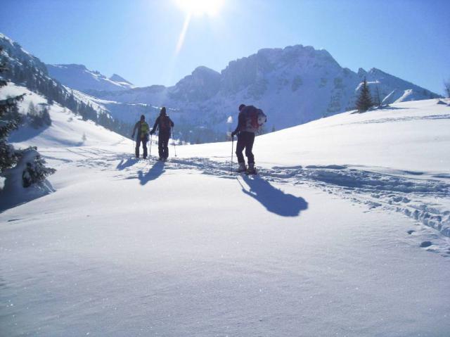 Tourenverhältnisse: Am Parkplatz bei erfrischenden -22°C gestartet und über die Fortstraße zum Niederleger. Auf der Straße liegt beim Felsriegel sehr viel Schnee und man geht sehr nah am Abgrund entlang . Ist aber gut zu befahren. Weiter durch denn lichten Wald zum Mittelleger. Ab hier alles in der Sonne. Der nächste kleine Steilhang ist, im Gegensatz zu den letzten Jahren (meistens hart und unangenehm) sehr gut zu gehen. Die letzten Hänge sind gut eingeschneit und es schauen kaum Latschen heraus. Nur an den kleinen westseitgen Geländekanten unterhalb des Gipfels, ist es auf ein paar Meter etwas steinig, da abgeblasen. Abfahrt in unverspurten Pulver zum Niederschlagsmesser. Da hier die Exposition etwas mehr südseitig ist, hatte es hier schon einen leichten Stich, aber immer noch sehr gut fahrbar. Im Schatten herrscht eh noch super Pulver. Weiter durch den lichten Wald im Pulverrausch zurück zum Parkplatz