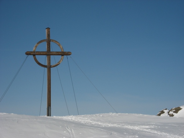 Temperatur beim Start im Tal bei -16 Grad. Am Gipfel aber angenehme Temperatur, wolkenlos und (fast) windstill. Allerdings muss man für die Gipfelrast einen Platz suchen, an dem man den ganzen Gipfelverhau nicht sieht.