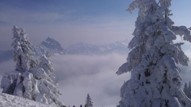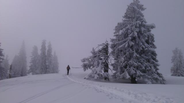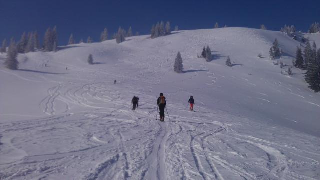Tourenverhältnisse: Sehr gute Tourenverhältnisse, ca. 15 bis 20 cm Neuschnee auf tragendem Untergrund. Durchwegs pulvrig; nur in der ausgewiesenen Schneise durch die Wiederaufforstung pistenartig, aber auch hier sehr gut zu fahren. Waldweg noch griffig. Sichtverhältnisse heute teilweise eingeschränkt, da Hochnebel grenze auf ca. 1500 m, darüber sonnig. Nach wie vor sehr kalt.