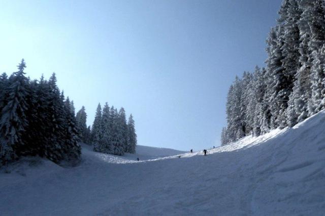 Für die Abfahrt fand sich im oberen Teil am Rand der Schneisen noch schöner Pulverschnee, die Schneisen selber waren pistenmäßig eingefahren. Leider sind die Wolken nicht ganz weggangen, so dass die Aussicht begrenzt war.