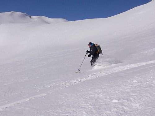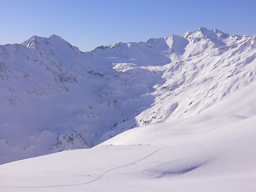 Sonntag: Aufstieg Peischlkopf - Abfahrt Maroital mit anschließendem Aufstieg Gstainsjöchl und Abfahrt ins einsame Verwalltal (Expo Süd Pulver am Peischlkopf, Expo Nord super Pulver beim Aufstieg zum Gstainsjöchl, Expo Süd/Südost Pulver und Windpress bei der Abfahrt ins Verwalltal).