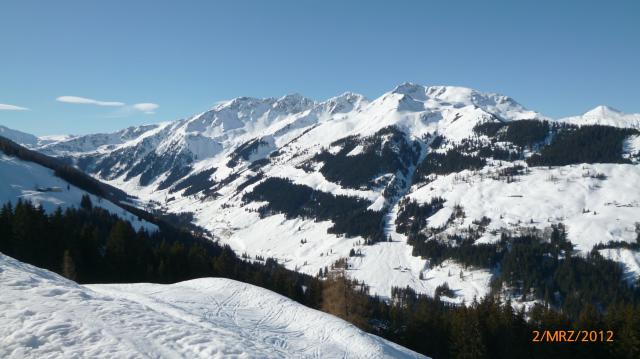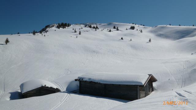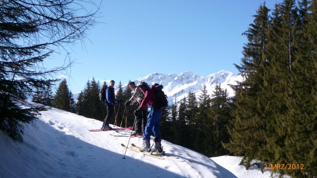 Tourenverhältnisse: Vom AP über freie Wiesen (hartgefroren) und Forststwege hinauf zur unteren u. später zur oberen Prädastenalm. Inzwischen wurde es etwas weicher, da die Sonne um die Kurve kam.