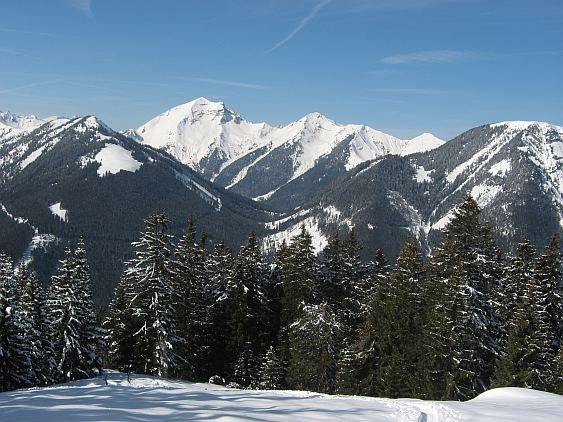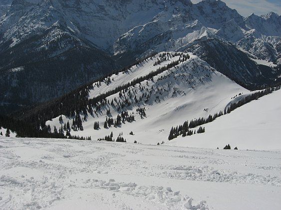 Tourenverhältnisse: gut. Der Gipfelhang hatte (mittags) wenige cm leicht angefeuchteten Pulverschnee auf meist guter Unterlage (nur gelegentlich hat auch das Gras rausgeschaut). Nach dem kurzen Gegenanstieg dann schattseitig im Wald Pulver und sonnseitig auch Firnansätze. Die Forststraße war dann - besonders im mittleren Teil - leicht sulzig, aber immer noch zügig zu fahren.