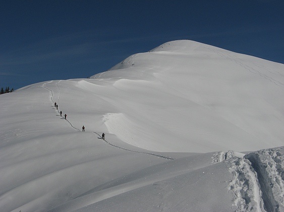Frage: westlich unterhalb des Jochs, das man beim Gegenanstieg vom Gipfelhang erreicht, haben wir (= ein zufällig in diesem Augenblick zusammengewürfelter Haufen) ein Skitourenschild entdeckt mit einem Pfeil nach rechts (im Abfahrtssinn, aber noch keine Spuren). Kurz danach konnte man noch eines zufällig entdecken, das komplett im Schnee verschwunden war (wiederum Pfeil nach rechts). In dieser Richtung sind wir dann im Wald auf einem Wegerl abgefahren und waren an einer Stelle, an der man ganz leicht die frühere Abfahrtsroute erreichen konnte. Wir haben wieder angefellt und sind zu der über uns liegenden Aufstiegsspur - die von den meisten anderen als Abfahrt benutzt wurde (aber keine Schilder zu sehen waren) gegangen und von dort abgefahren. Was ist nun die richtige Route?