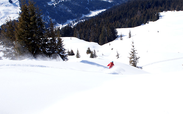 Tourenverhältnisse: Sonne, Pulver, Firn und für einen einen Modeberg wenig Betrieb. Vom Gipfel bis zur Demmelhüttenalm unverspurter Pulver auf einer harten Unterlage, danach in Firn übergehend. Etwas lästig ist die geräumte und apere Forststraße im unteren Teil, die man im Aufstieg des öftern überqueren muss. Bei der Abfahrt kommt man aber ganz gut durch.