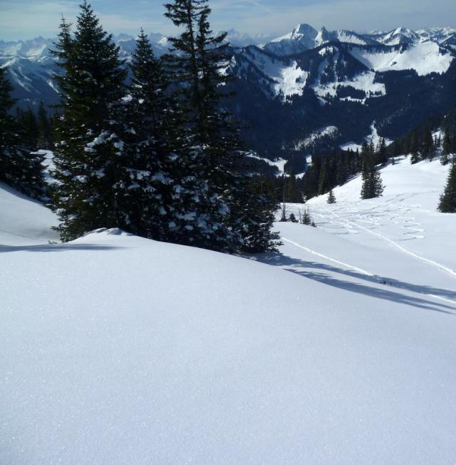 Tourenverhältnisse: Der Weg bis zur Bergwachthütte ist trotz der Schneefälle vom Freitag schon wieder komplett aper, ab dann gestern beste Bedingungen bis zum Gipfel. Bei der Abfahrt bis zum Schlepplift oben etwas verblasener Pulver, etwa 100HM unterhalb des Gipfel traumhafte 15cm Pulver, der im Schatten auch bis zum Nachmittag nicht feucht wurde. Und es gab noch genügend unverspurte Breiche. Kleiner Aufstieg über die Piste bis zum Taubensteinhaus und dann Abfahrt über die Piste bis zum Parkplatz der Taubensteinbahn. Auch hier war bis nach unten der Schnee im Schatten noch pulvrig.
