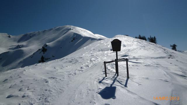 Tourenverhältnisse: Vom AP einige Meter zu Fuß zurück, dann über einen Bach, bis zum Beginn der Wiesenhänge. Schnee gut durchgefroren, minus 1 Grad .