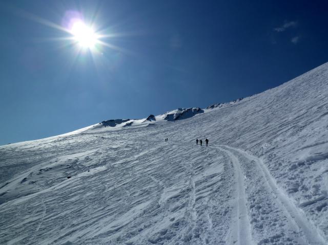Tourenverhältnisse: Sehr gut! Schnee von/bis Parkplatz. Wo es noch nicht verspurt war, gab es Pulverschnee. Gipfeltrittspur gut zu gehen (ein paar wenige hatten Steigeisen an, aber die waren ebensowenig nötig wie Harscheisen).