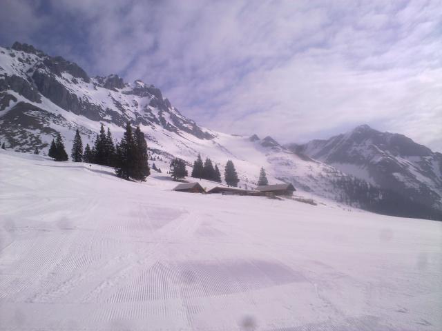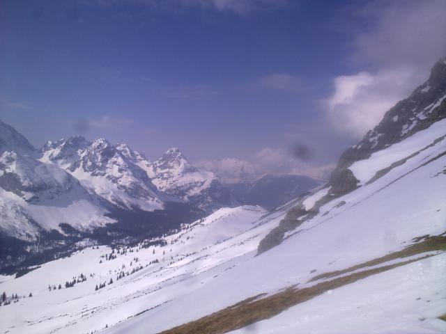 Der Aufstieg ist relativ gemütlich an der Piste zur Hochfeldern-Alm und dann je nach Geschmack die Hänge unten (lawinensicherer, durchgehend Schnee, aber eine Bachquerung) oder weiter oben (= Sommerweg, ganz kurze Unterbrechungsstellen, aber der Bach kann hier problemlos gequert werden) zum Gupf "Am Brand", 2120 m. Der Gupf selbst konnte heute wegen einem Wächtenüberhang nicht (bzw. nur mit größeren Mühen) bestiegen werden, aber etwas oberhalb gibt es schöne Rastplätze.