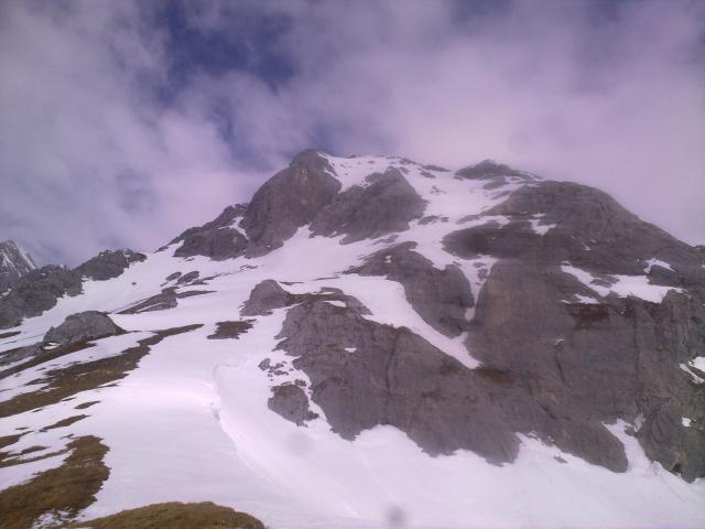 Da der Schnee um 11 Uhr noch recht hart war, überlegte ich den Weiterweg zu einem der Gatterlköpfe. Vom Am Brand sieht man einen teilweise sehr steilen Osthang direkt über Felsabbrüchen, der scheinbar bis zum Gipfel des Östlichen Gatterlkopfes geht; das war mir aber zu heftig. Meine Idee, etwas weiter westlich zu gehen, war aber auch nicht viel besser, nur schattiger - Skier mussten schon bald getragen werden, was eine sehr mühsame Stapferei war. Schließlich habe ich unter den Felsen Halt gemacht - es gibt in den Hängen unterhalb der Gatterlköpfe so viele Varianten bei hinreichendem Schnee, das ohne gute Ortskenntnisse schwer zu sagen ist, was die beste Gipfelvariante ist.