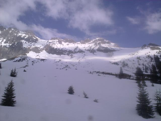 Die Abfahrt in der Steilrinne (12:40) oben bot leider keinen Firn, sondern etwas feuchten Pulver auf Harsch - auch passabel zu fahren, nur die Steilheit und die Felsen trüben den Genuss, stürzen sollte man eher nicht. Auf den freien Hängen dann super Firn, nur die letzten 100 Hm zur Feldern-Alm waren schon etwas sumpfig. Nach Sonnentanken ging es über das Issentalköpfl zurück, Pisten waren schon sehr stark aufgefirnt.