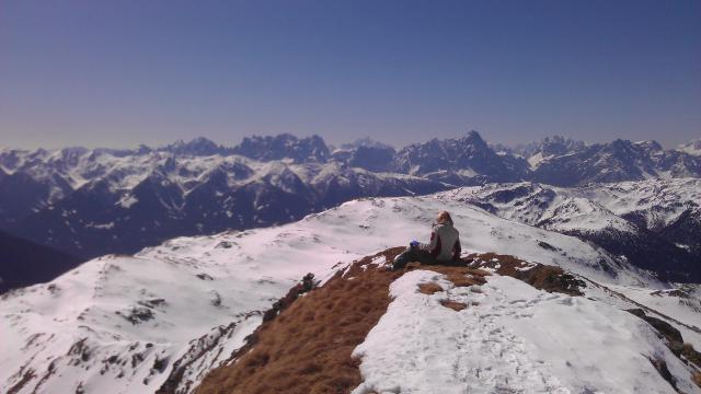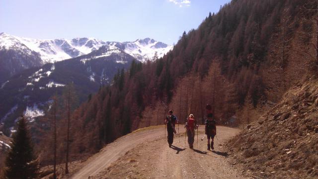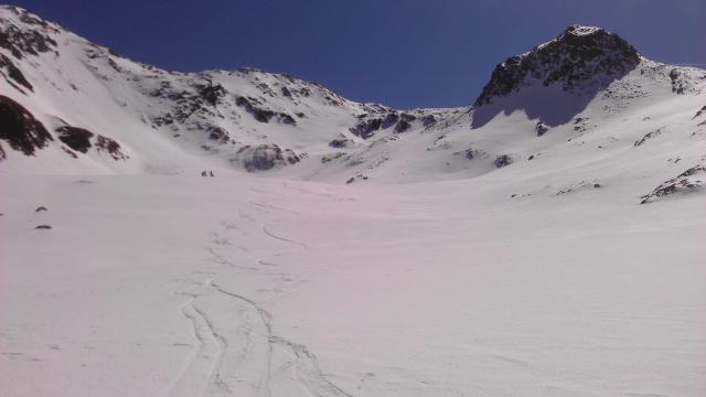 Auch heute nochmal, weil es gestern so schön war. Nach einer Stunde Ski tragen beginnt der Schnee. Gestern noch leicht angepulvert, heute schöner Firn. Oben hat es schattseitig etwas neuen Triebschnee.