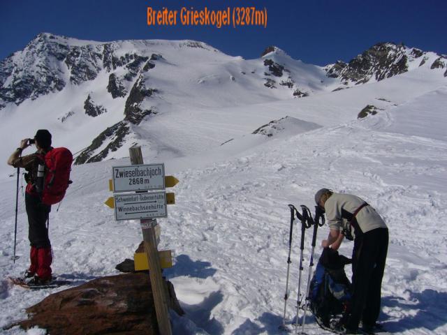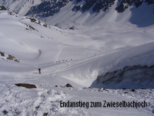Tourenverhältnisse: Bis zum Zwieselbachjoch war eine Schneeschuhspur vorhanden; Gipfelhang war unter einer dünnen Pulverschneedecke hart