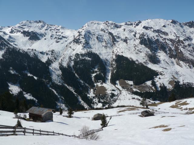 Pofersalmen: im unteren Teil grosse apere Flächen; für den Aufstieg reicht's gerade noch, bei der Abfahrt muss man schon genau schauen, wo man sich noch durchwurschteln kann. Im oberen Teil der Pofersalmen dann geschlossenen Schneedecke, sofern man sich einigermassen rechts (Aufstiegsrichtung) hält.