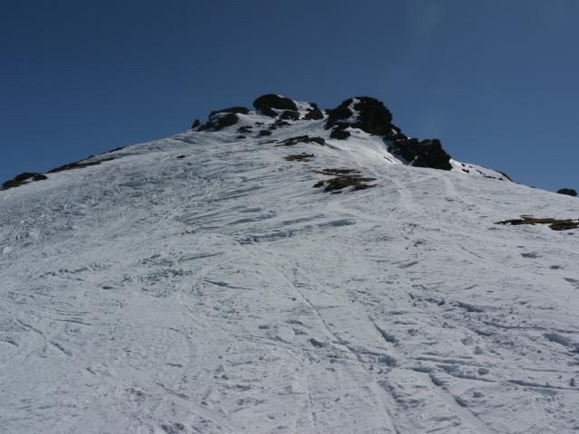 Gipfelaufbau: derzeit ist es einfacher, den felsigen Vorgipfel linker Hand zu umgehen; die Variante durch die Felsen wurde von zu Fuß gehenden Skifahrern ziemlich zerhackstückt