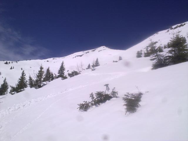 Sonstiges: Heute wegen des angekündigten Wetters nur eine kleinere Tour von Lähn zum Pitzenegg. Startpunkt ist direkt am Bahnhof Lähn. Auch wenn es nicht so ausschaut (direkte Anstiegshänge zum Pfuitjöchle praktisch völlig aper), geht es noch fast durchgehend mit Skiern hoch und runter (2x kurz abschnallen, alte Skier empfehlenswert). Das dürfte sich unten aber sehr bald ändern, an Ostern wahrscheinlich nicht mehr lohnend. Der Anstieg (und auch die Abfahrt) durch das Wiestal sind etwas hakelig, bin ohne Harscheisen gegangen, wären am Vormittag in der schattigen Rinne aber nicht schlecht gewesen. Ab dem Ausstieg aus der Rinne des Wiestals einfach.