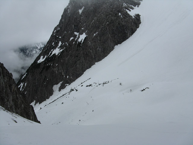 Gefahreneinschätzung: Wegen schlechter Sicht sind wir in der Rechtskurve des Viererkars umgedreht. In der Nebelsuppe hörte man immer wieder kleine Schneerutsche rumpeln.