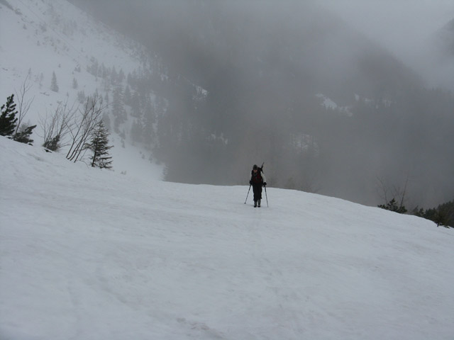 Gefahreneinschätzung: Wegen schlechter Sicht sind wir in der Rechtskurve des Viererkars umgedreht. In der Nebelsuppe hörte man immer wieder kleine Schneerutsche rumpeln.