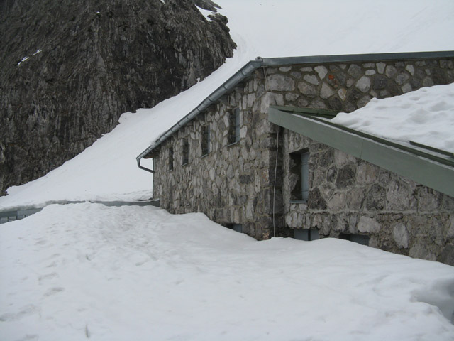 Tourenverhältnisse: Die durchgehende Schneedecke beginnt nach der vierten Kurve der Forststrasse. Kanonenrohr pistenartig mit 5cm Schnee im Übergang von Firn zum Sulz auf fester Unterlage (kein Harschdeckel mehr wie bei martinkrea). Im Viererkar weiche Unterlage mit brüchigem Harschdeckel drauf, da drauf Pappschnee.